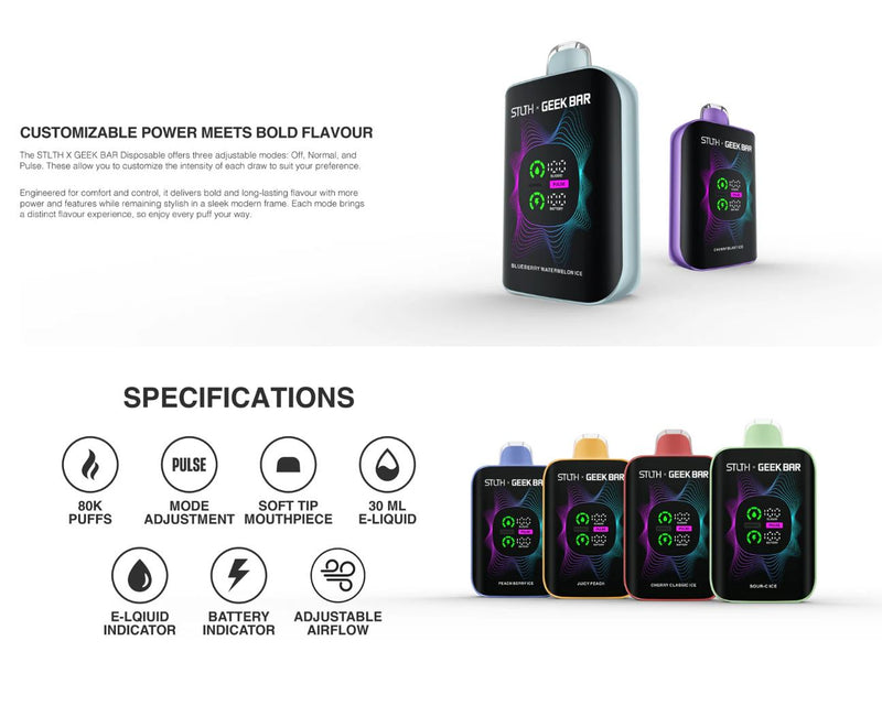 STLTH X GEEK BAR Disposable, a premium collaboration that brings the best of both STLTH and GEEK BAR into one powerful, sleek device! Boasting a generous 30mL e-liquid capacity for up to 80,000 puffs, this device delivers enduring performance you can rely on, offering satisfaction from start to finish.