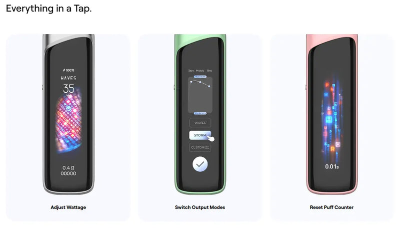 vUWELL CALIBURN G4 PRO POD KIT [CRC] is powered by a built-in 1800mAh battery with a maximum output of 35W. It is compatible with both the previous and upgraded GPP Cartridges, which feature anti-leak technology for mess-free vaping. The device includes a groundbreaking touchscreen UI that simplifies operation, making core functions accessible with a single tap. It also features a 2.51-inch ultra-shatterproof display and offers 6 engaging UI themes. Additionally, it has an ergonomic, contoured mouthpiece for a smoother and more comfortable draw.