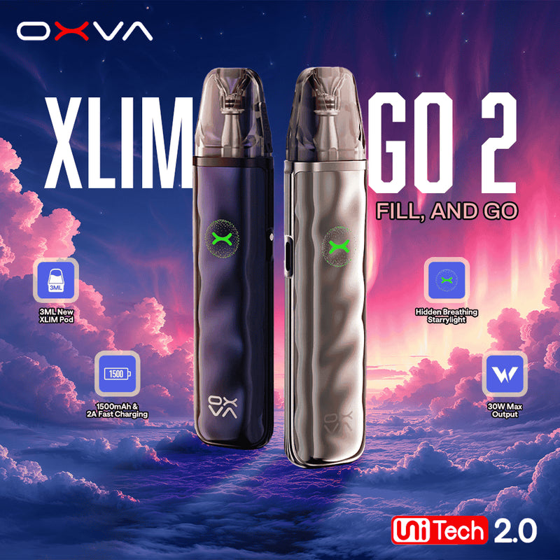 OXVA XLIM GO 2 POD KIT [CRC] is an easy-to-use, refillable pod device featuring a high-density 1500 mAh battery with 2A fast charging, delivering up to 30W of power. Key features include ergonomic airflow control, a unique starry glow lighting effect, and a three-colour battery level indicator. The OXVA XLIM GO 2 POD KIT [CRC] includes an OXVA XLIM V3 Replacement Pod [CRC] (0.8 OHM), designed with a leak-resistant 2 ml e-liquid chamber and a top-filling port for hassle-free refilling.